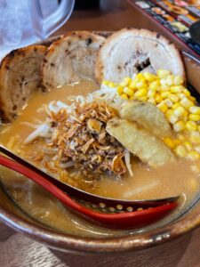 店内はゆったり目でタブレットで注文する形式。北海道味噌チャーシュー麺にコーントッピング、+味噌焼飯を注文、5分くらいで着丼!